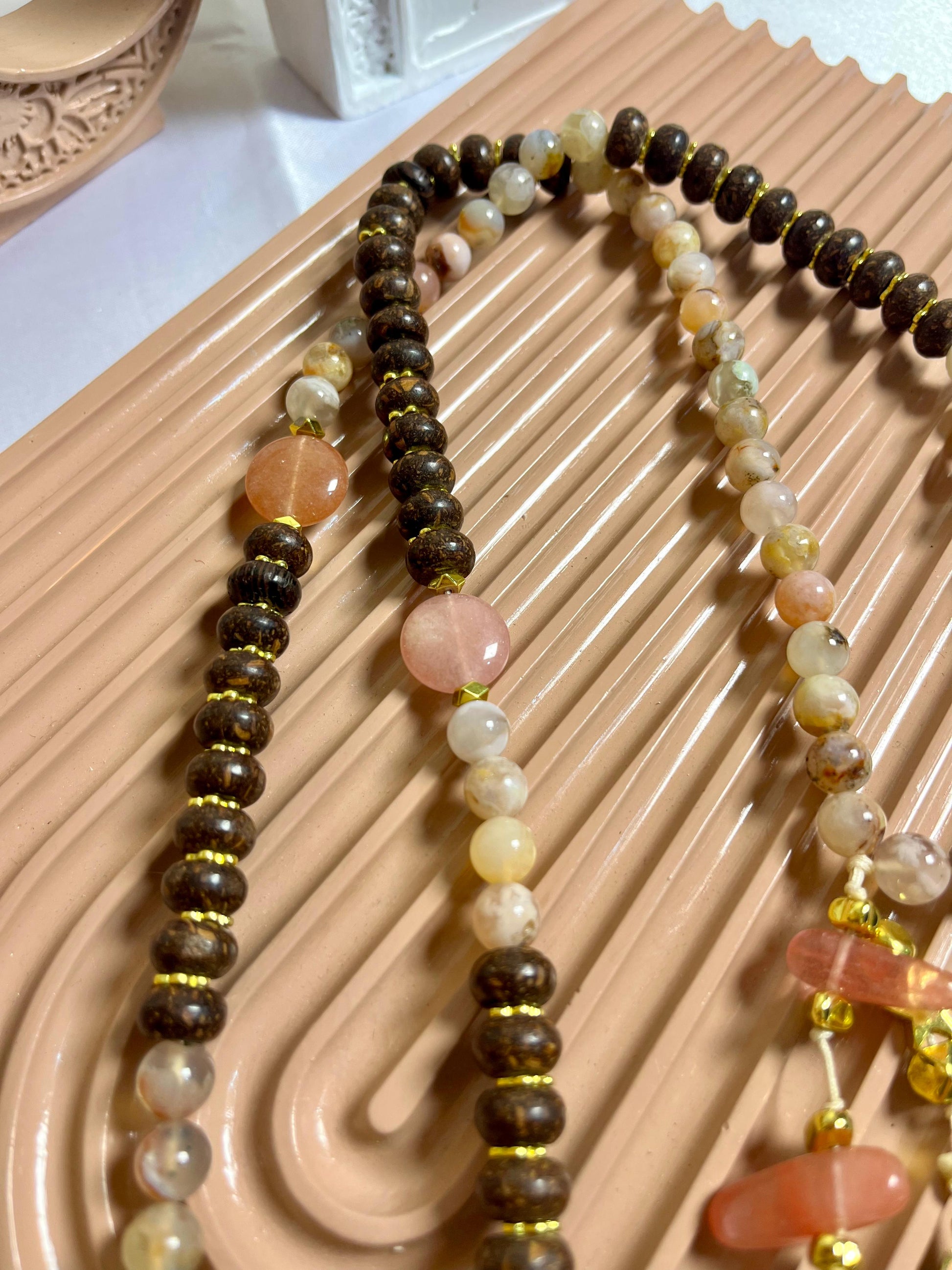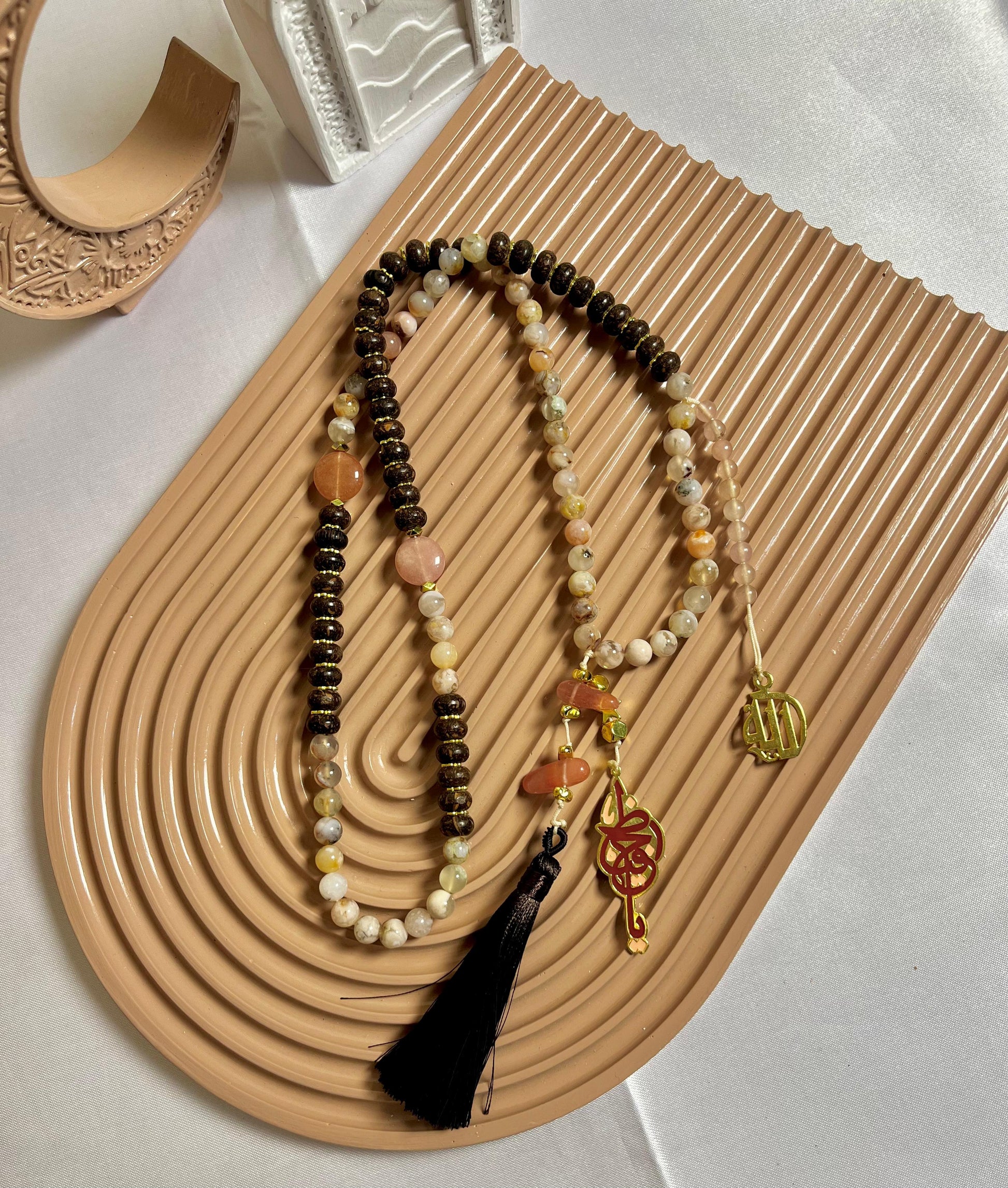 Inspired by warm mystical vibes, this set combines carnelian stones—resembling authentic Egyptian tea—with dark wooden beads. Featuring the "Ya Hayyu Ya Qayyum" pendant, it reflects the spirit of seeking strength and support from the Divine with every bead.