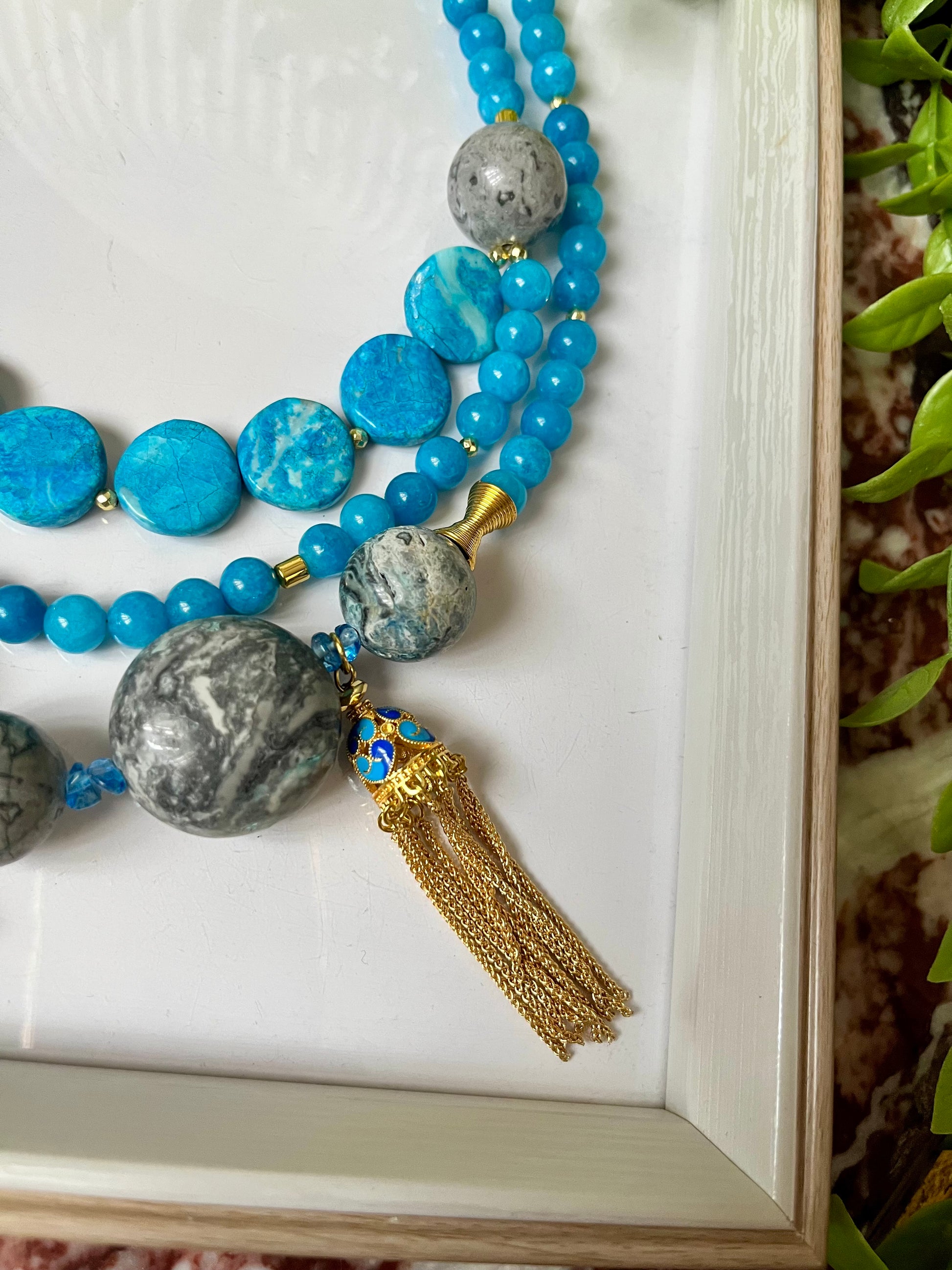 A beautiful three-strand necklace handcrafted with a rich mix of materials. It pairs smooth, polished turquoise beads and flat discs with marbled gray Jasper stones. The design is elevated by delicate gold accents, including a petite tassel and two sparkling celestial star charms.