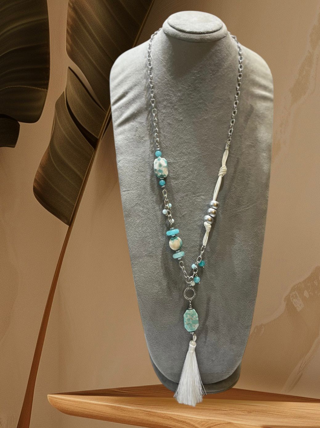 This is a long, elegant pendant necklace featuring a striking bohemian design.
