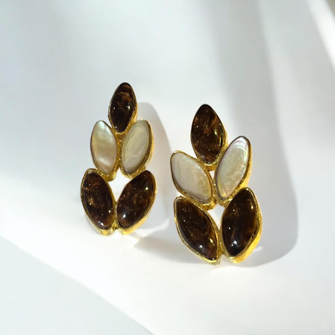 These are gold-tone stud earrings featuring a layered leaf or branch cluster design. They are set with five marquise-shaped cabochon stones: alternating between a rich, dark brown/smoky resin or stone and iridescent mother-of-pearl or shell.