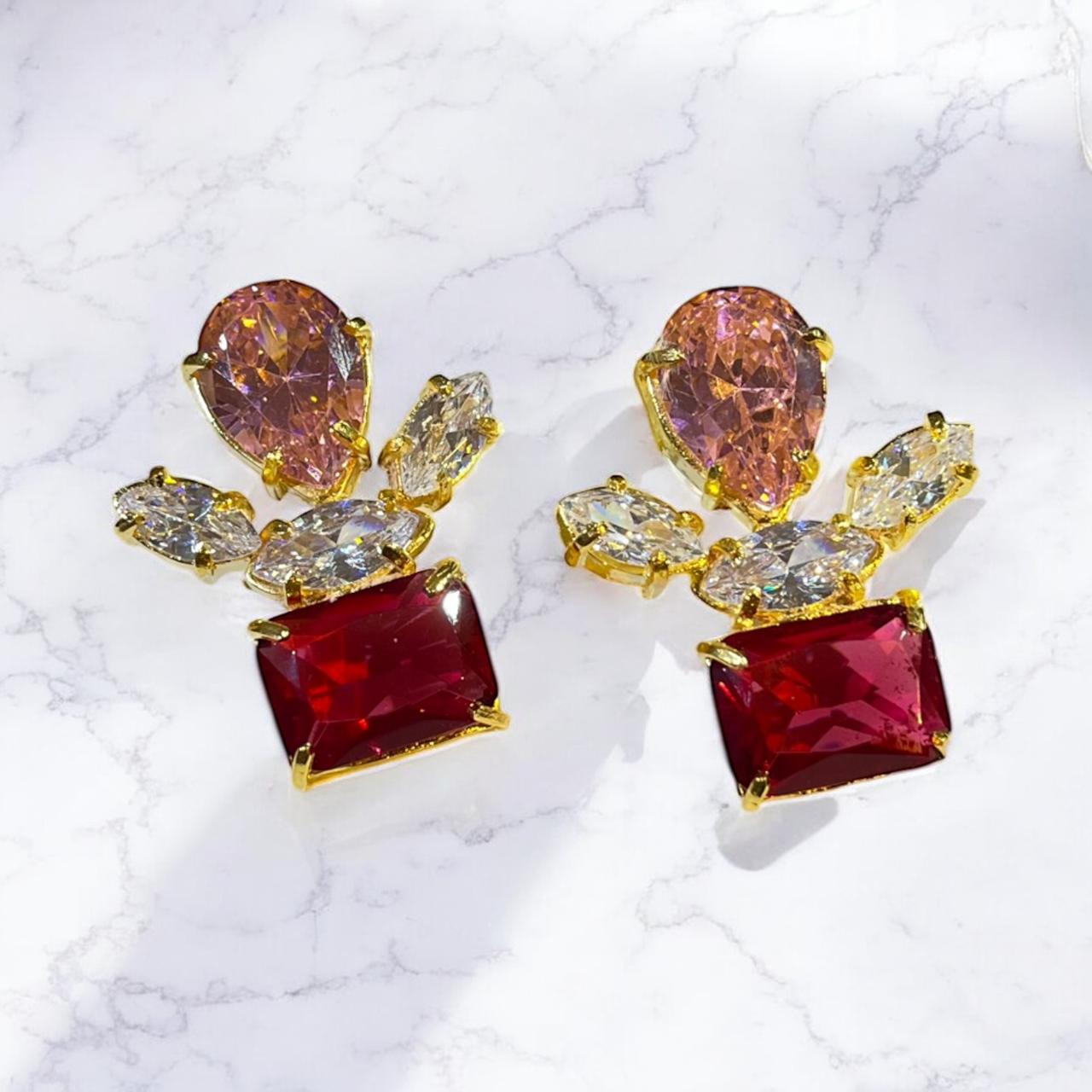 These are bold, chandelier-style stud earrings set in a gold-tone metal. Each features a cluster of multi-cut, brightly colored cubic zirconia or glass stones: a large rectangular ruby-red stone at the base, a tear-drop pink-champagne stone at the top, and two smaller marquise-cut clear stones flanking the center, creating a brilliant, high-drama look.