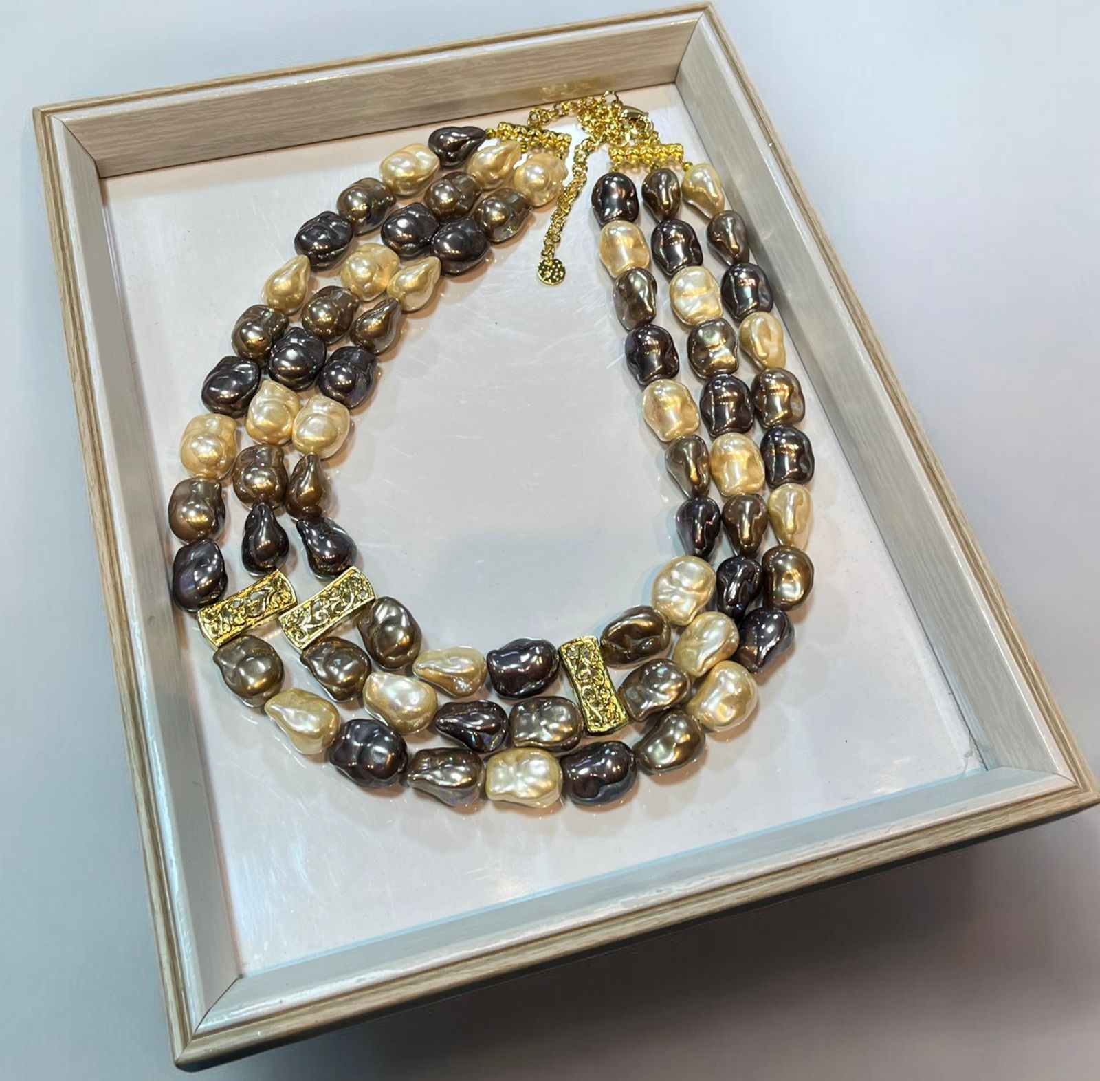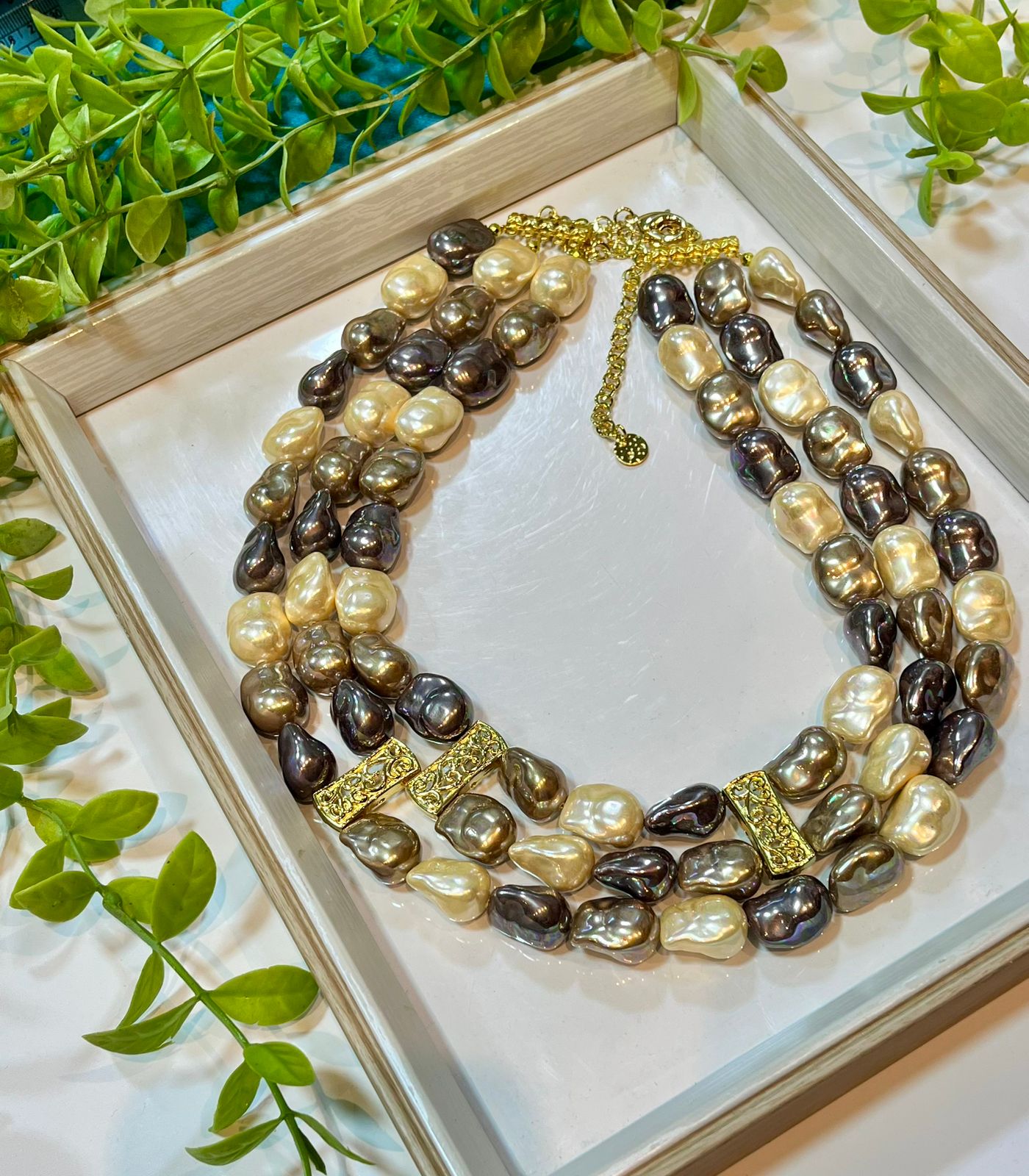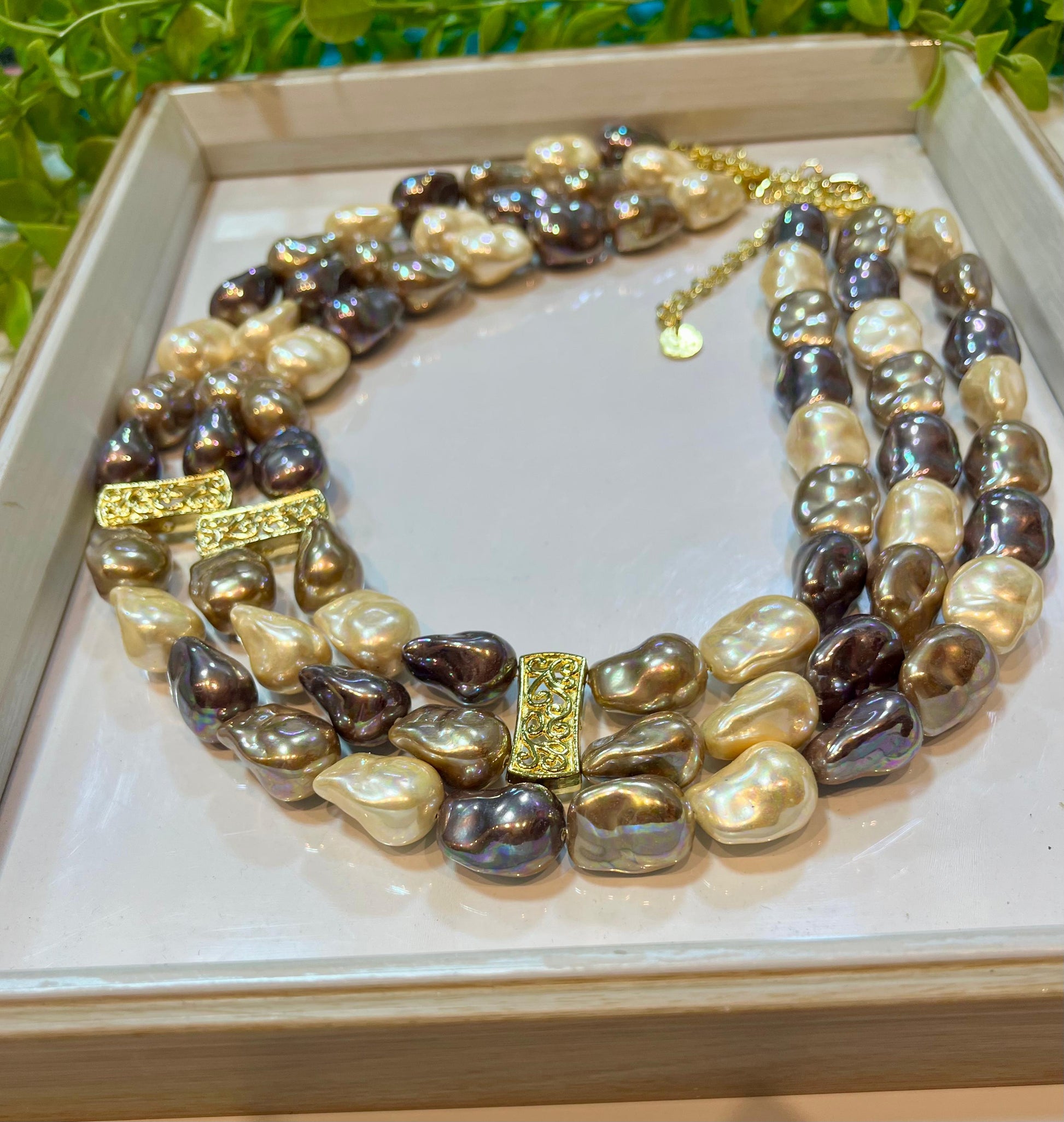 A bold and dramatic statement piece inspired by the solar disc symbols found in ancient Egyptian ornamentation. This open, rigid gold collar is intricately adorned with cascading tassels of Lapis Lazuli and rectangular pearls. The design features large textured gold rings and hanging discs, offering a majestic and striking drape across the shoulders.