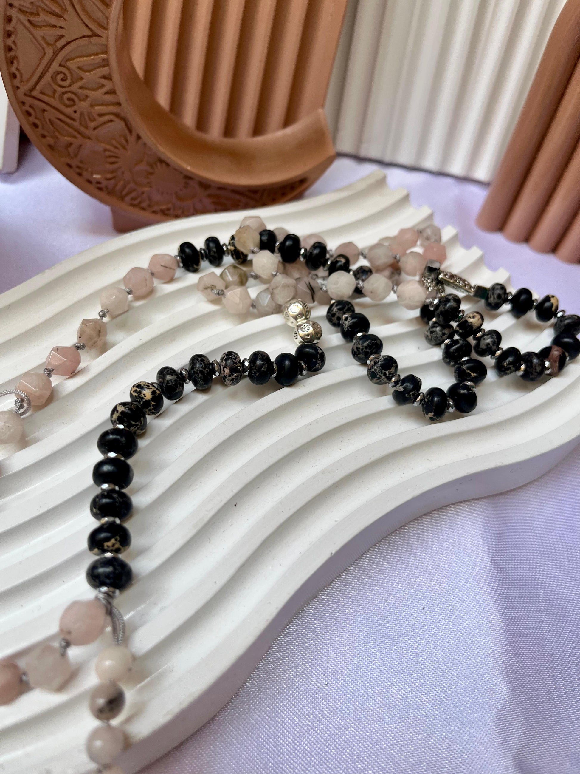 An elegant black and silver prayer bead set, featuring a stunning 'MashaAllah' charm. Its sophisticated design combines spiritual depth with modern style