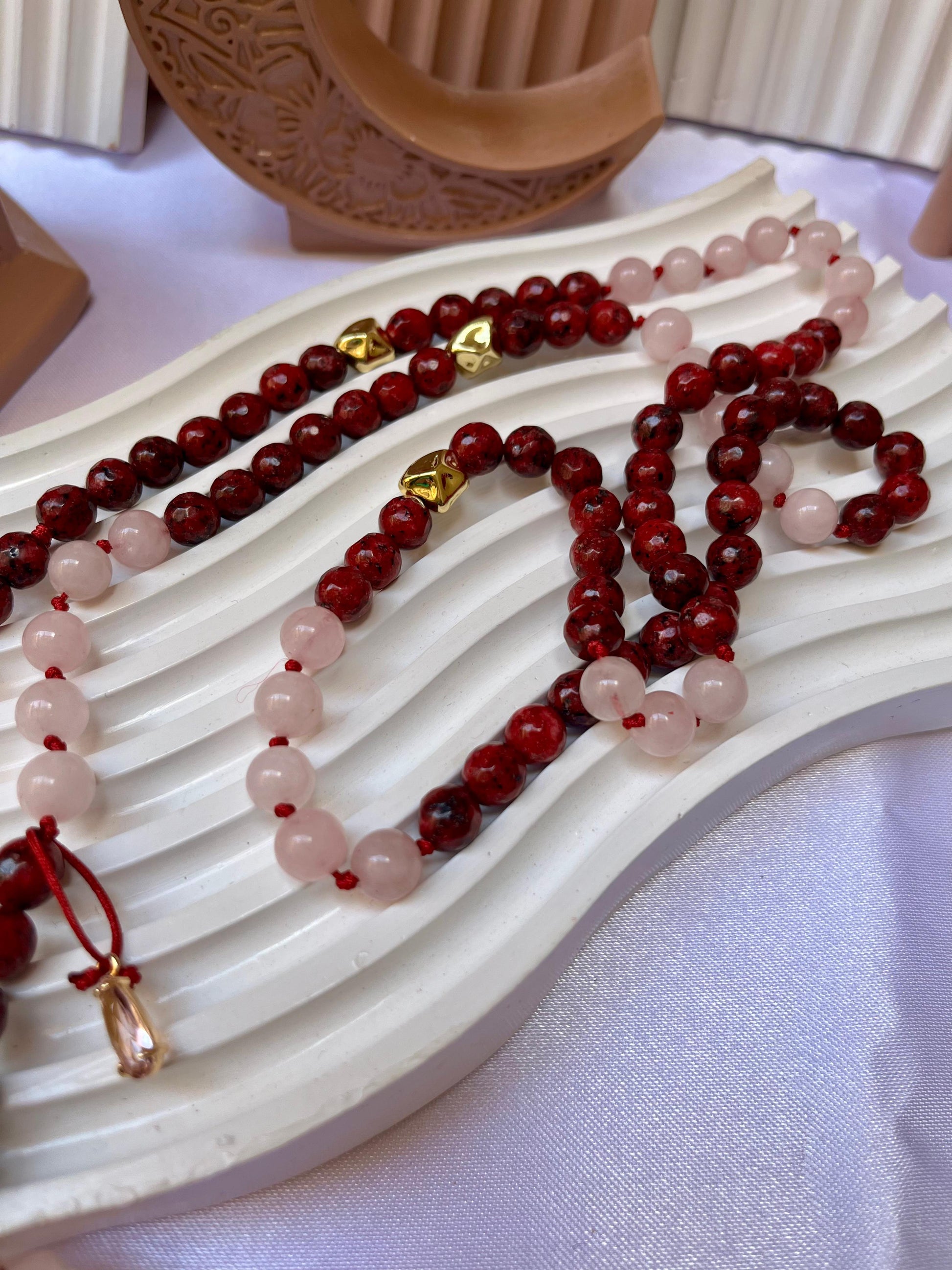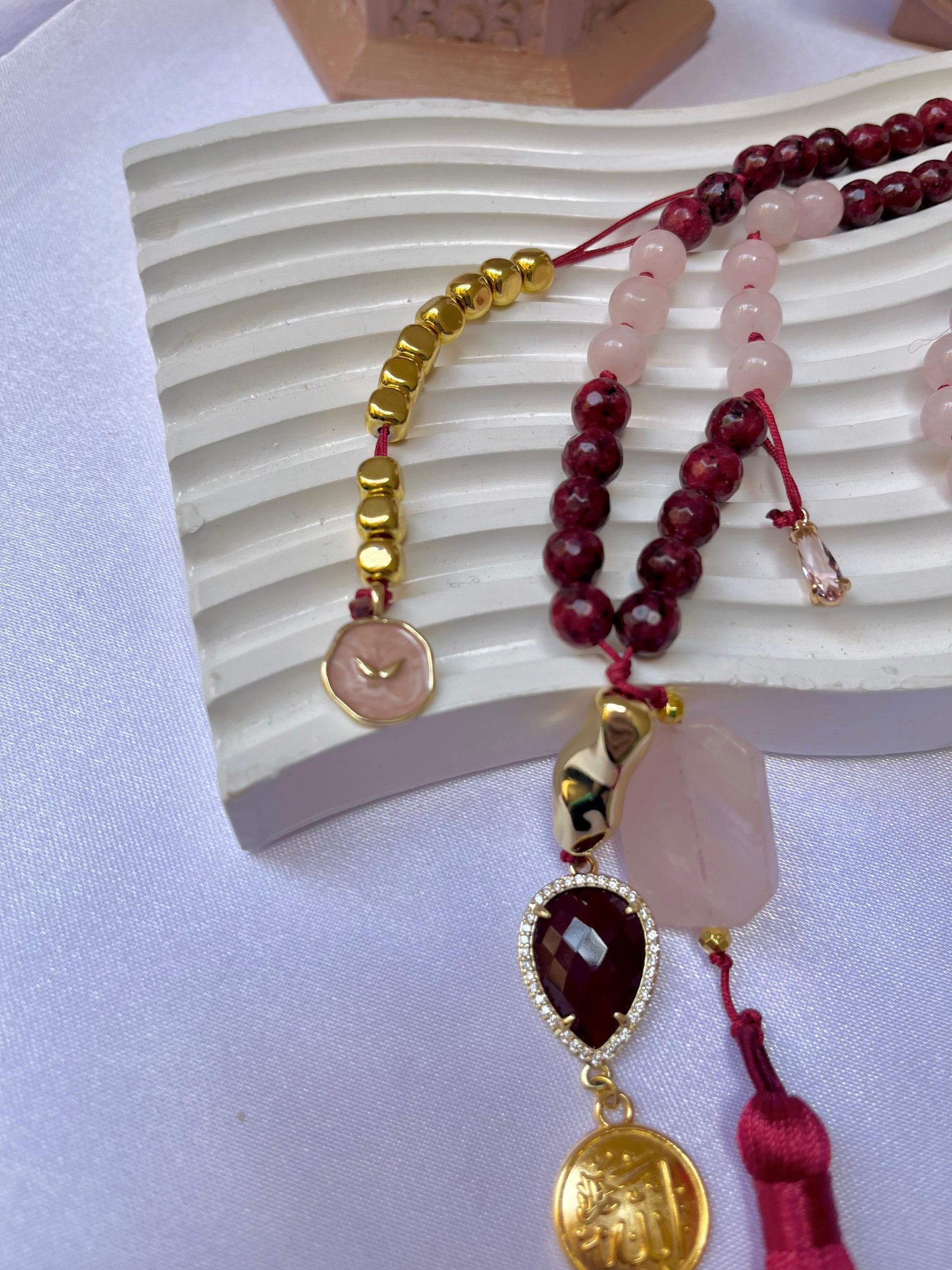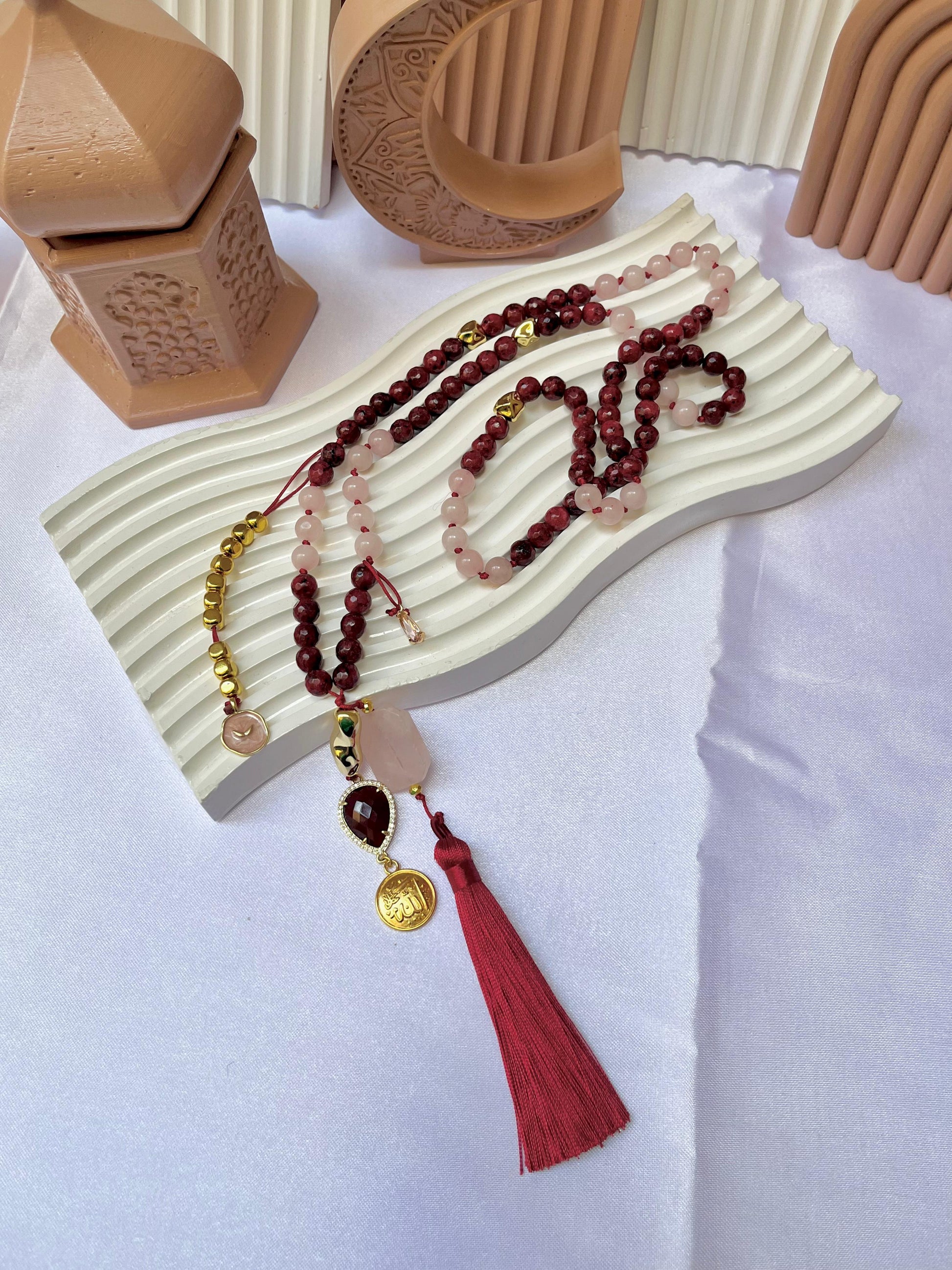 A stunning harmony of passion and peace. This handcrafted rosary features a delicate mix of soft rose and deep ruby-red beads, beautifully accented with golden touches. Adorned with a golden 'Allah' charm and a luxurious silk tassel, it’s designed to add elegance to your spiritual journey and make every moment of remembrance special