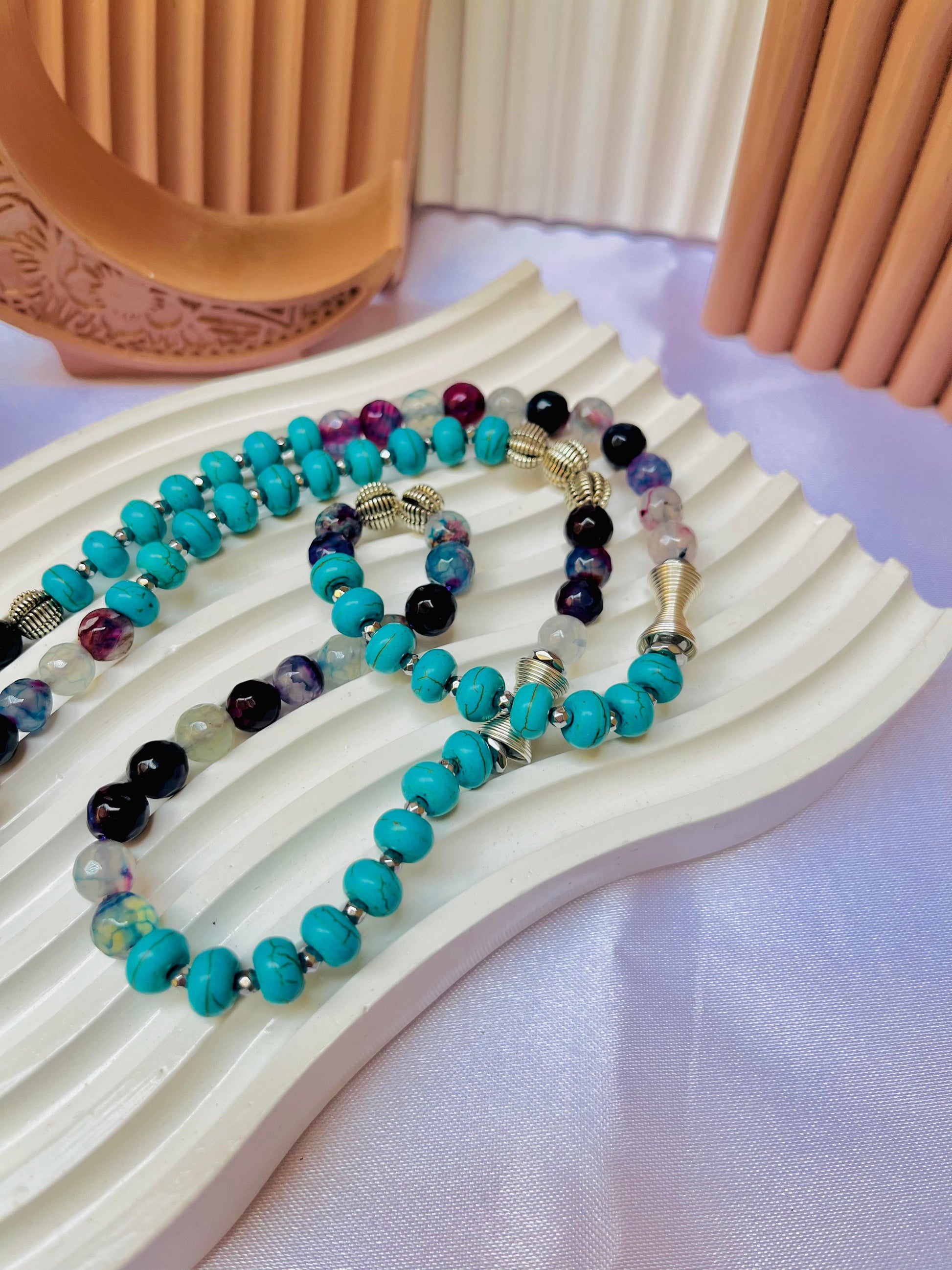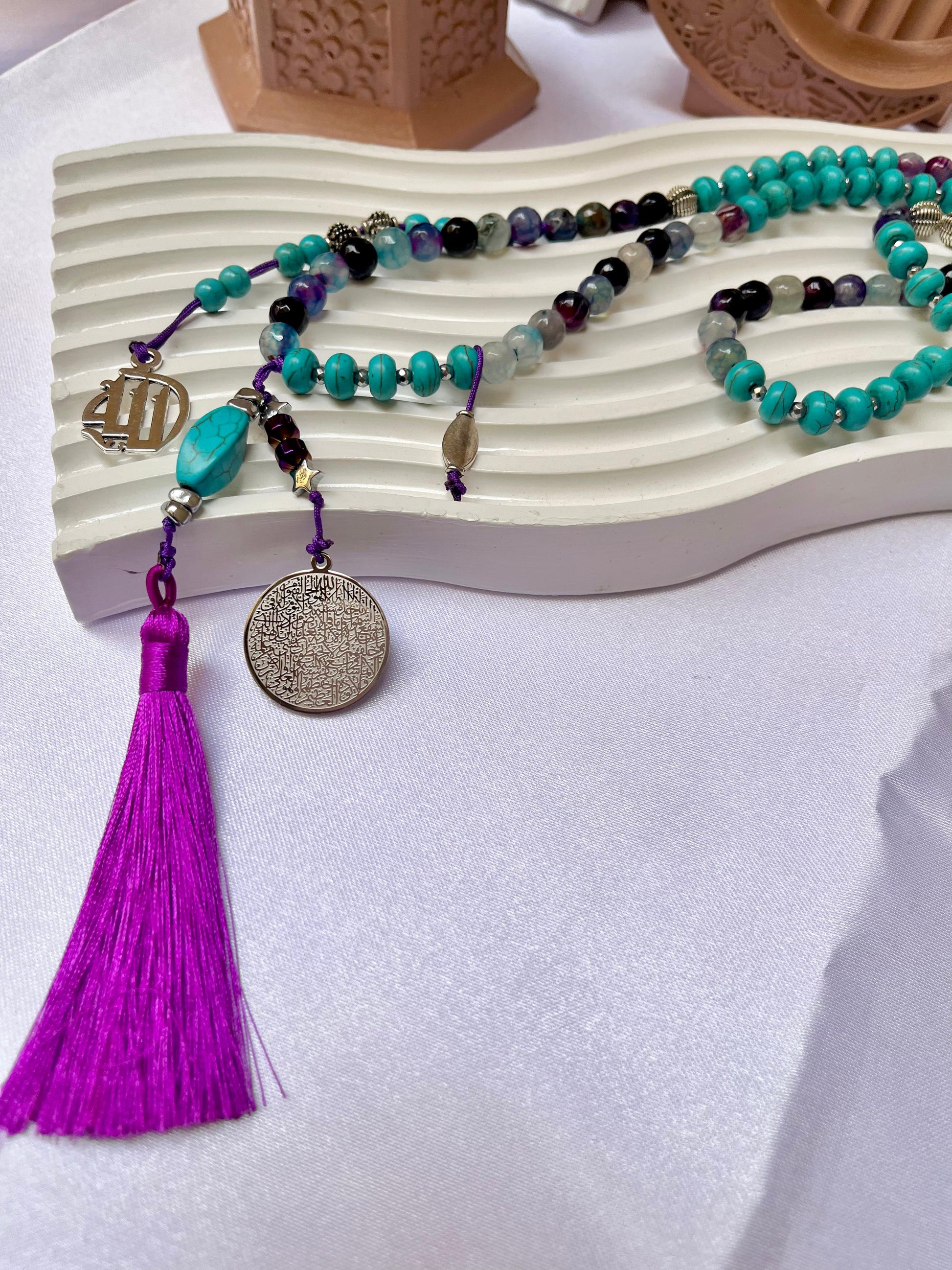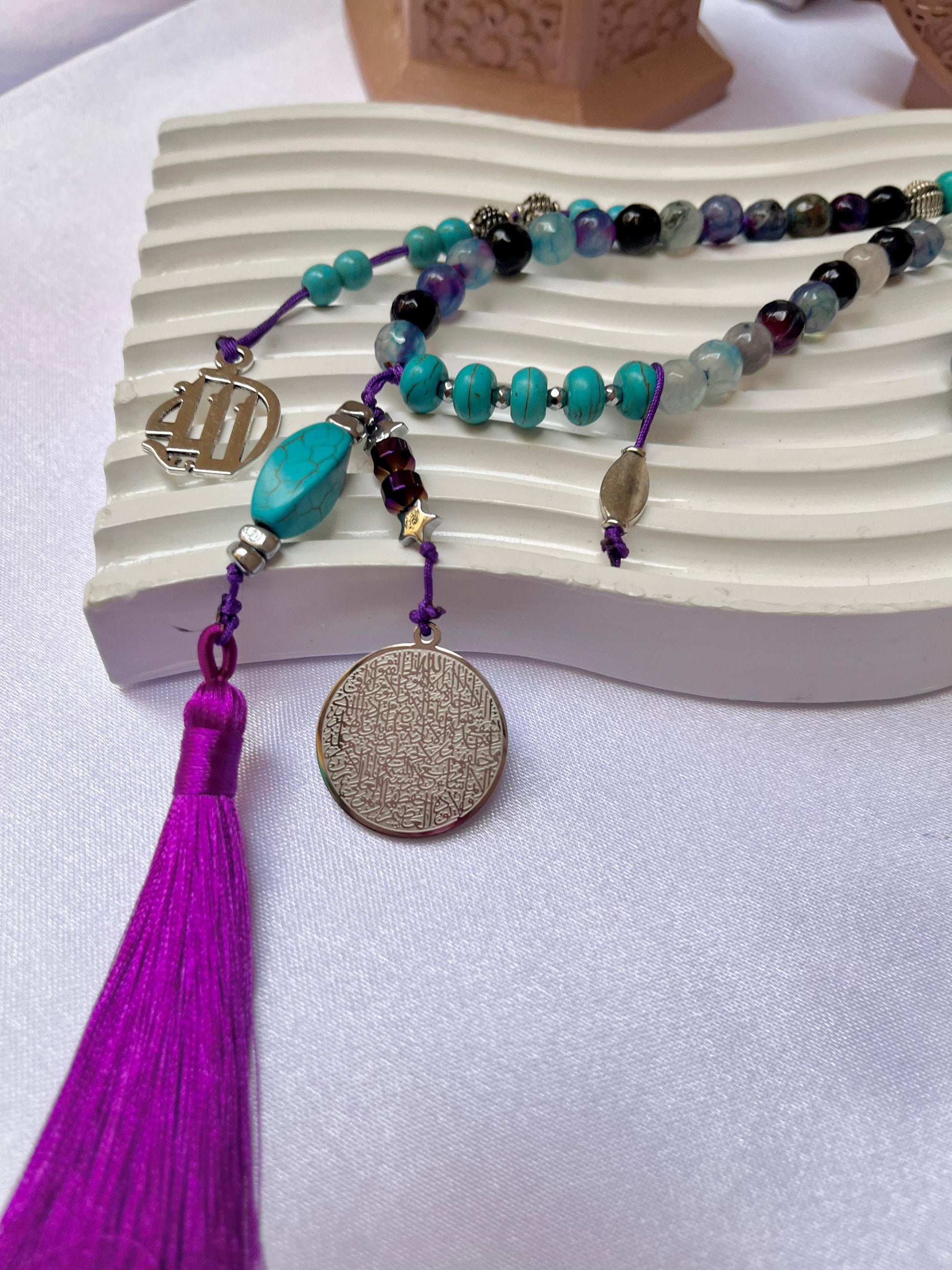 A vibrant blend of serenity and faith. This handcrafted rosary features a striking mix of turquoise and deep purple beads, centered by a majestic silver medallion engraved with Surah Al-Fatiha. Finished with a rich purple tassel, it’s a piece designed to inspire peace and remind you of the 'Opening' of all blessings in your life.