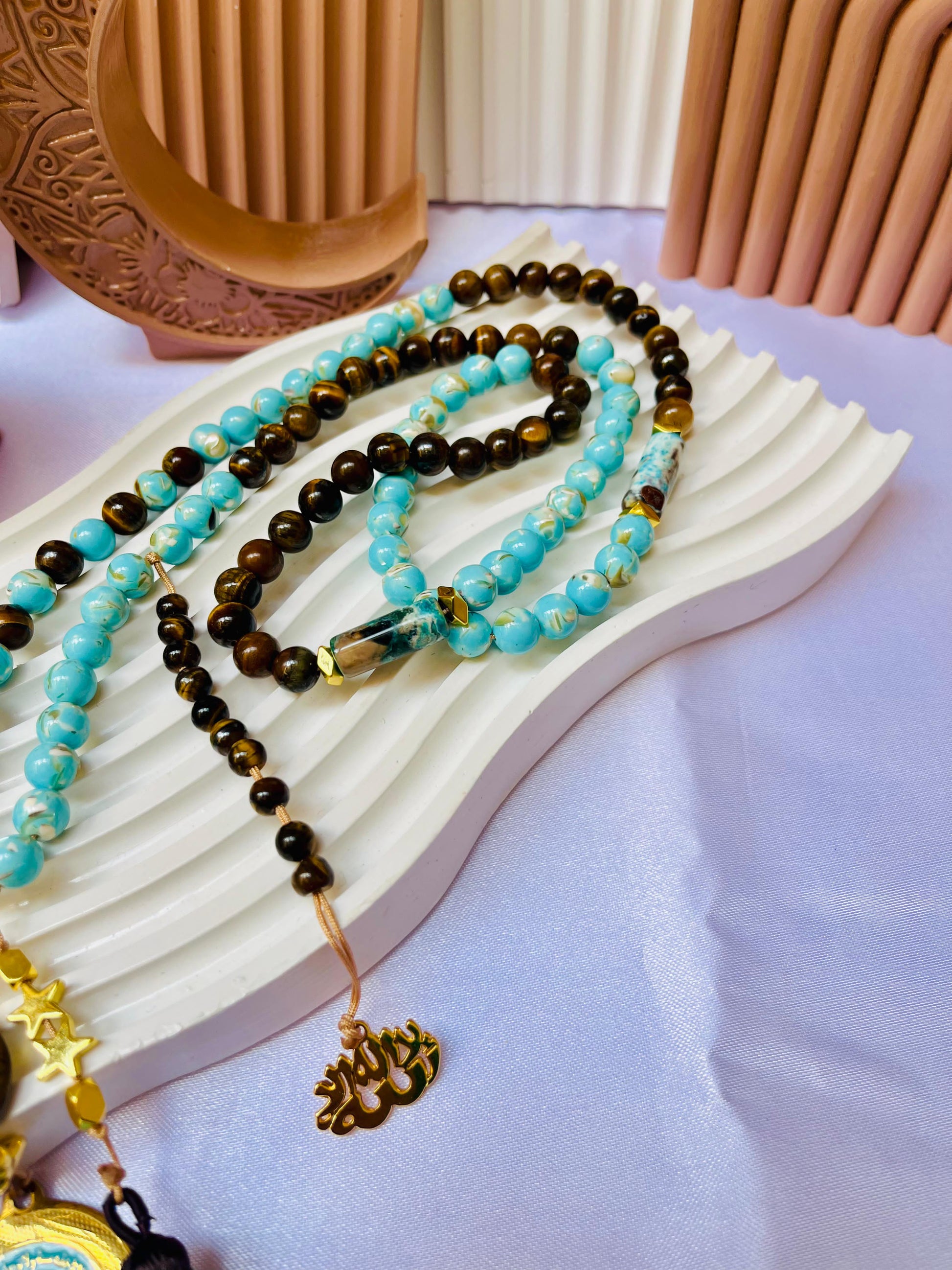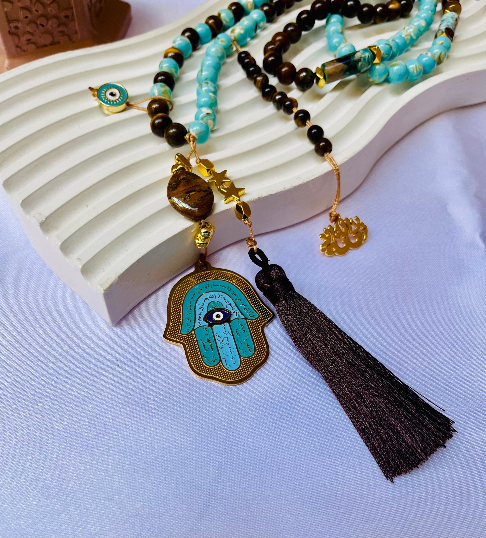 A powerful fusion of tradition and natural beauty. This striking rosary features a mix of Tiger Eye stones and vibrant turquoise beads, accented with a golden 'Hand of Fatima' (Khamsa) pendant. With its protective symbolism and rich colors, it’s a statement piece designed to bring strength and peace to your spiritual daily routine