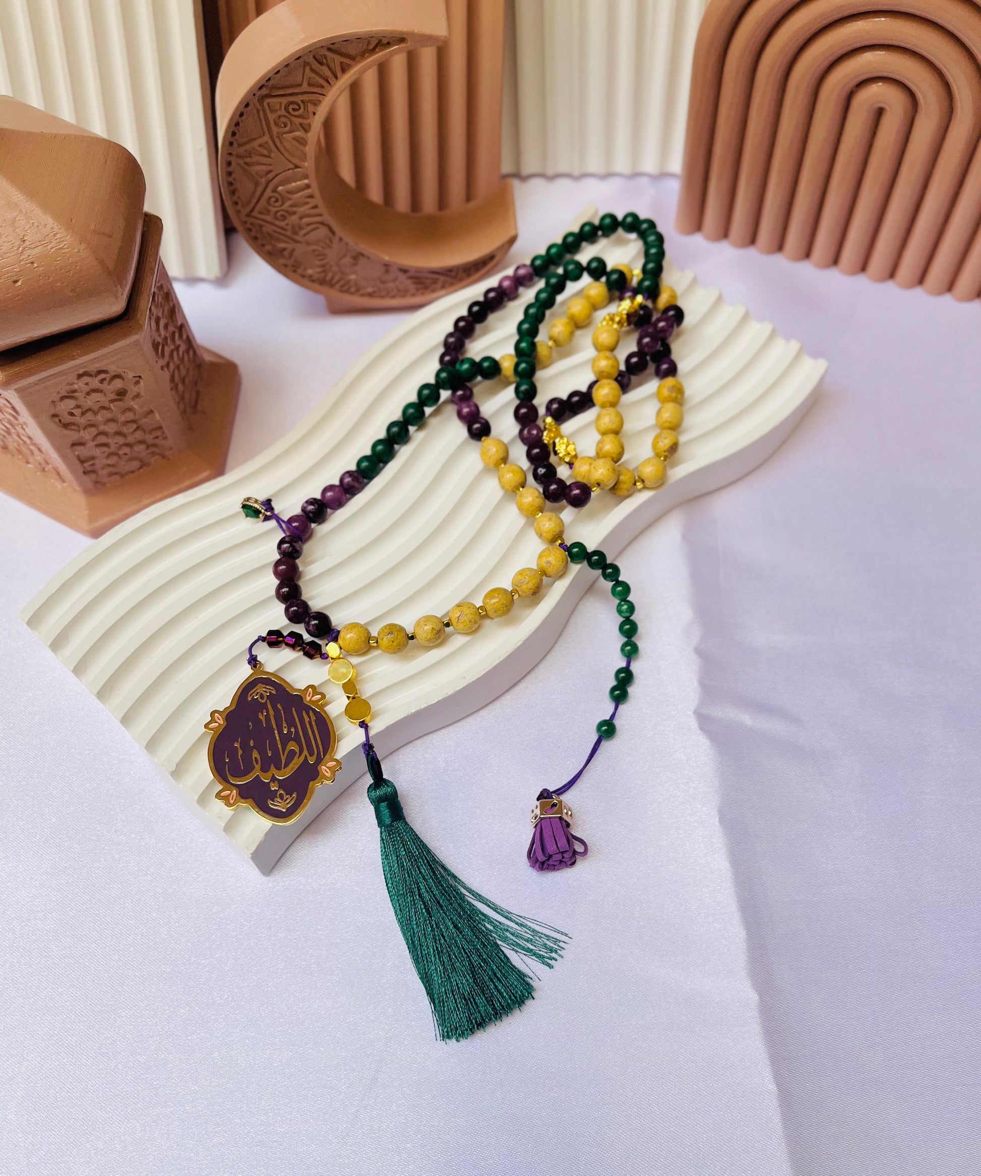 A dual masterpiece of peace and devotion. This unique rosary features a reversible pendant: one side bears the Divine Name 'Al-Latif' (The Most Subtle & Kind), and the other carries the comforting words 'His kindness overcomes my fear.' Paired with a vibrant mix of emerald, violet, and golden beads, it’s a soulful companion that reminds you of Allah’s infinite mercy in every breath.