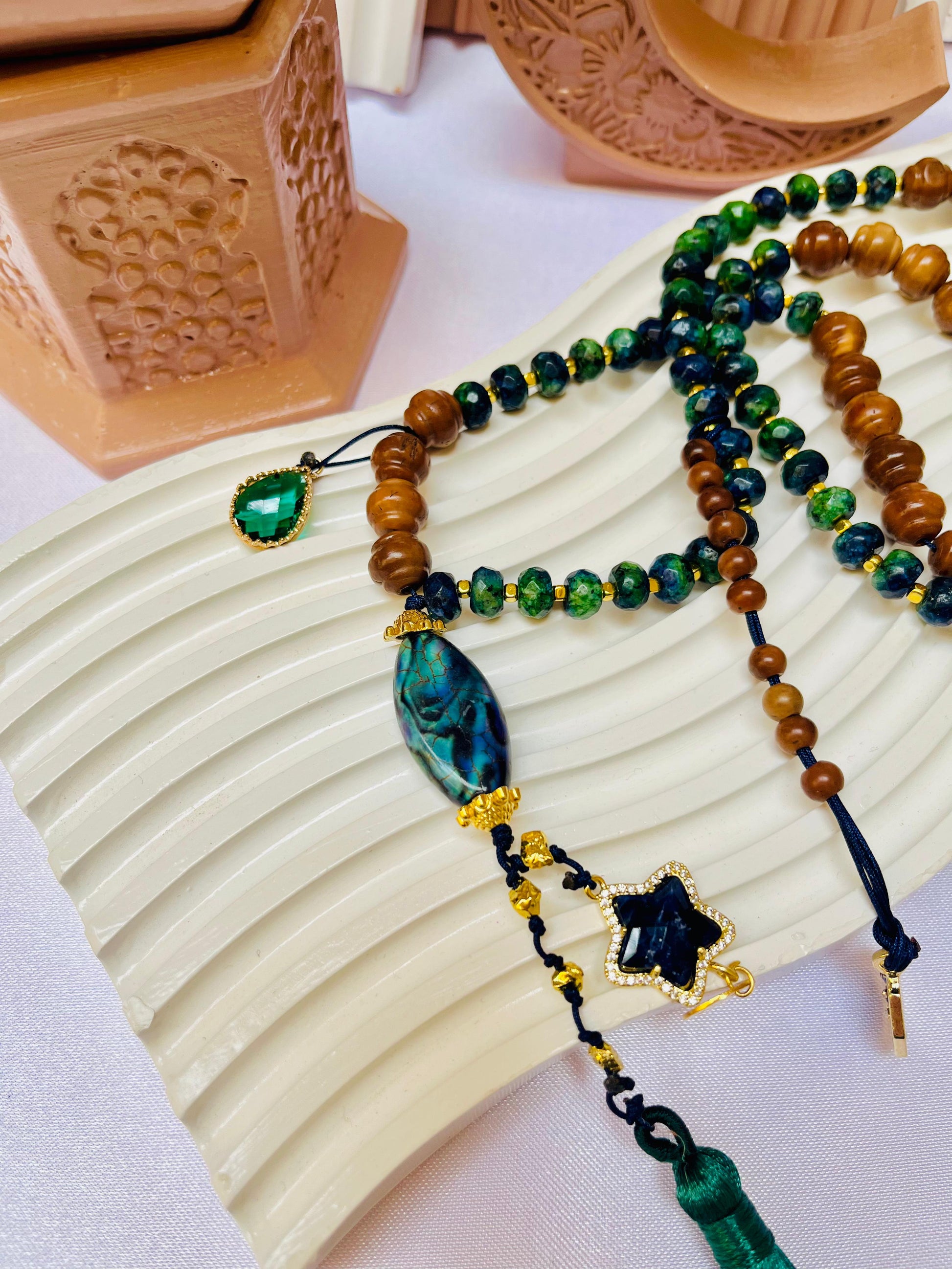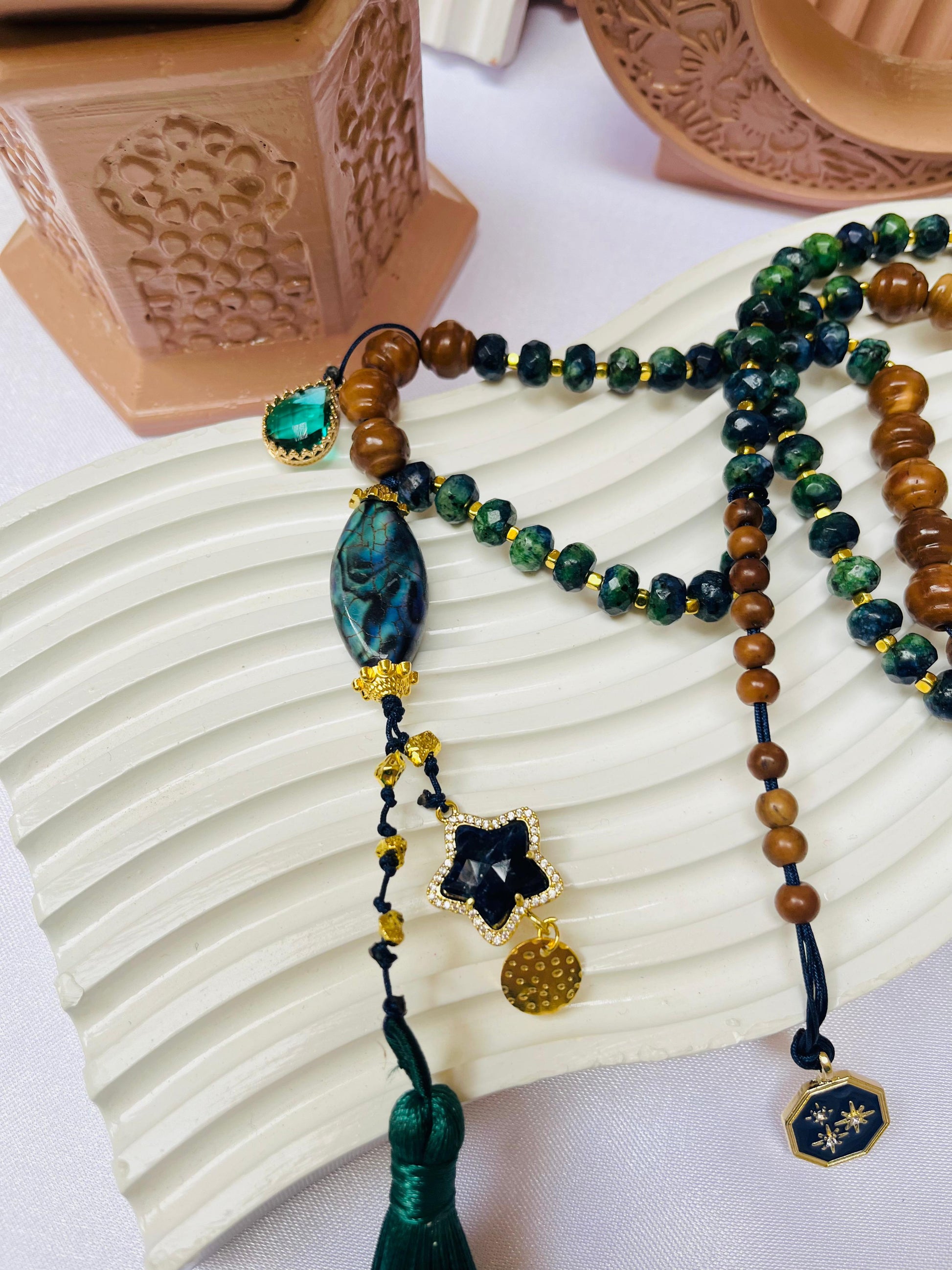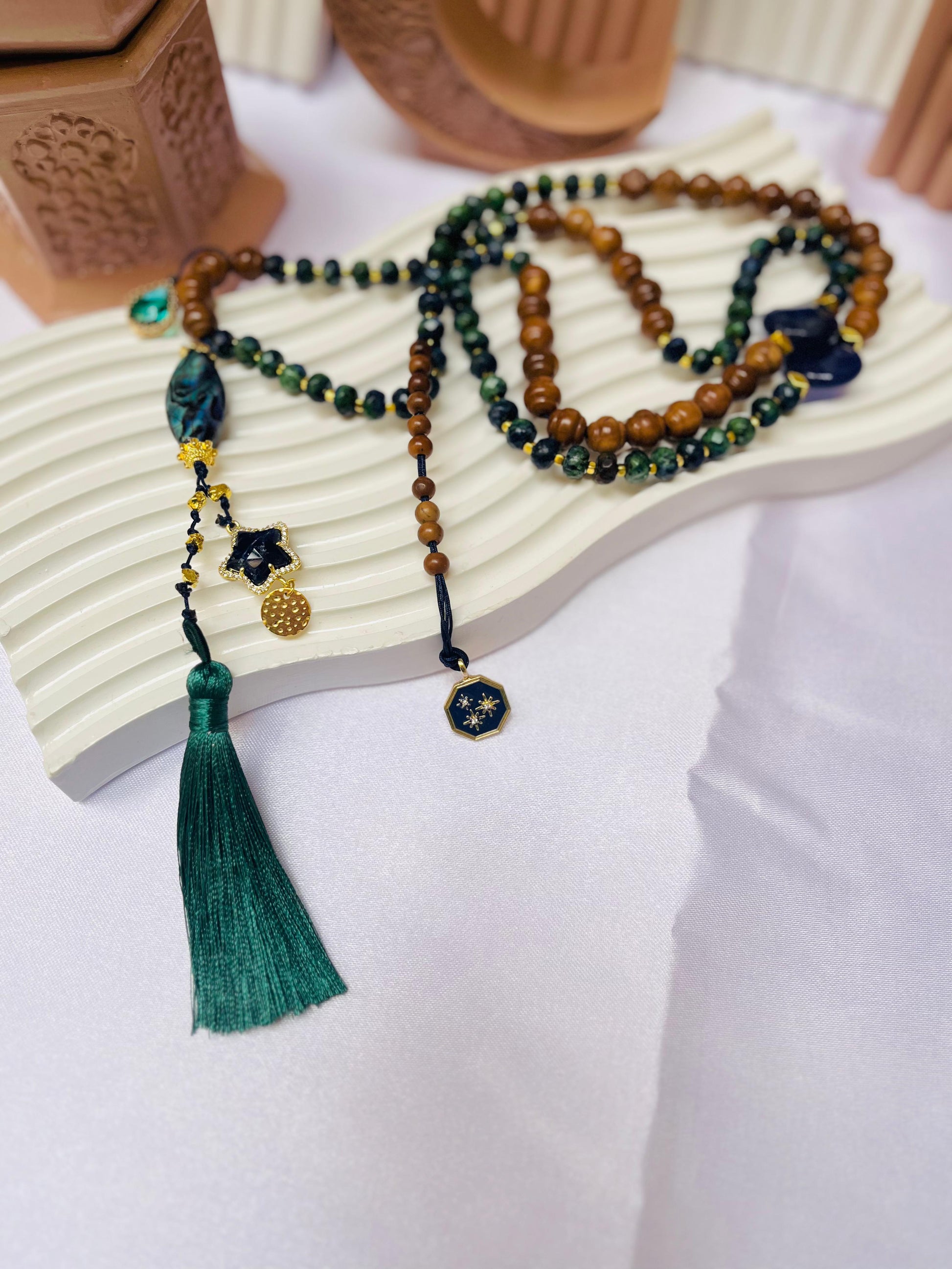 A timeless piece that blends tradition with spiritual elegance. This handcrafted rosary features a warm mix of earthy wooden beads and natural stones, highlighted by a magnificent golden pendant intricately engraved with Islamic calligraphy. With its rich amber tones and a silky golden tassel, it is designed to ground your soul and elevate your daily Dhikr.