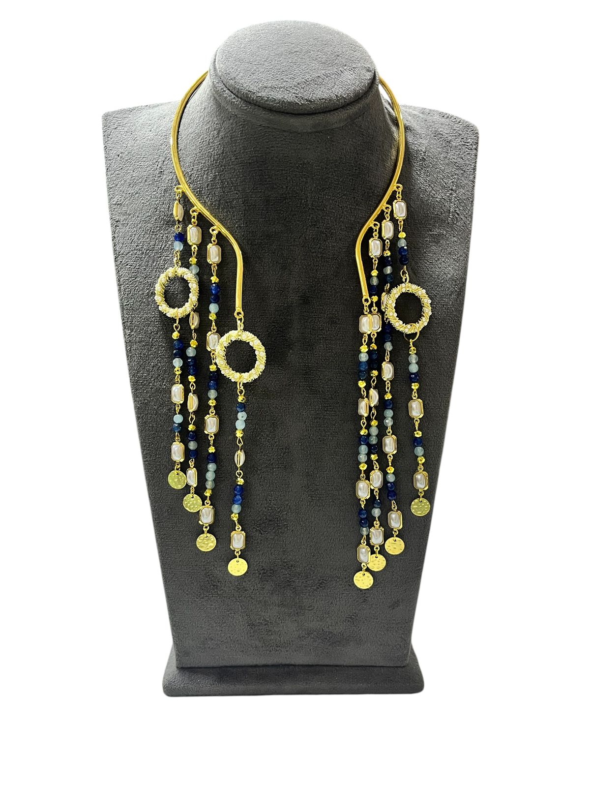 A magnificent statement piece inspired by the grandeur of Pharaonic royal collars and the power of the goddess Hathor. This long, striking design features a rigid gold structure from which cascading strands of deep Lapis Lazuli and softer complementary gems fall elegantly. It perfectly combines ancient Egyptian opulence with modern, dramatic flair.