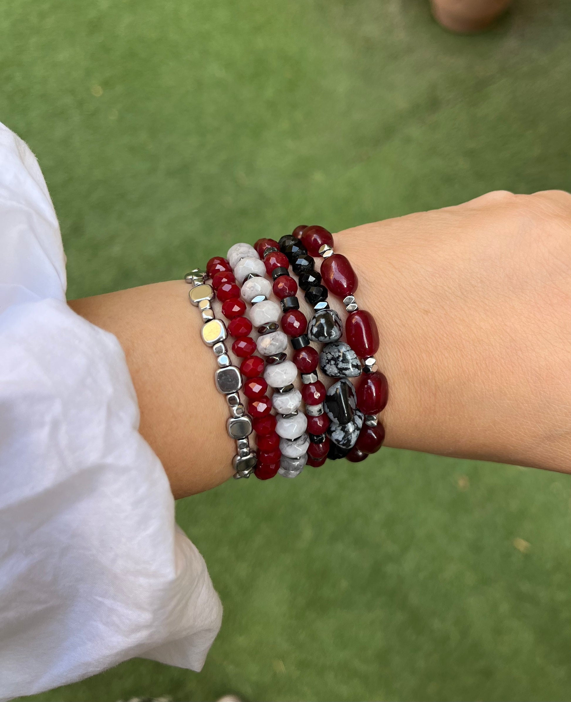 A set of 6 different bracelets made out different stones and hematite
