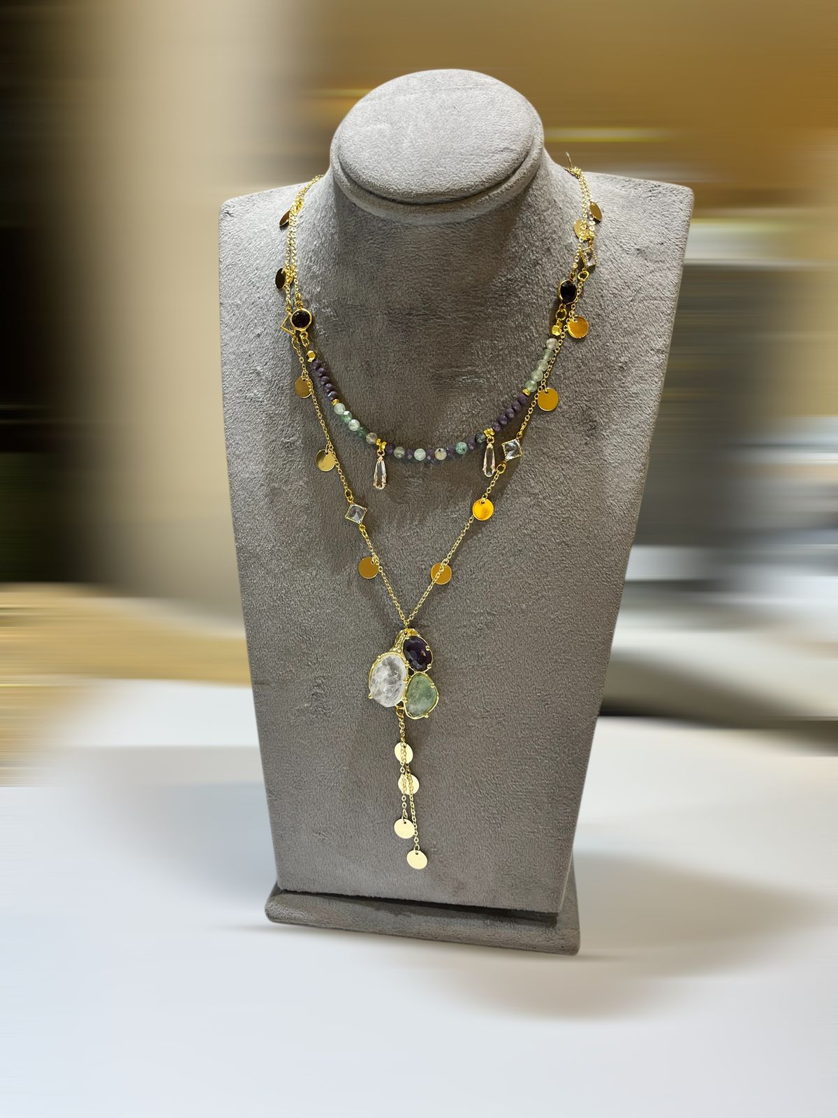 This layered necklace is rich in texture and color, combining beads, natural stones, and gold accents.