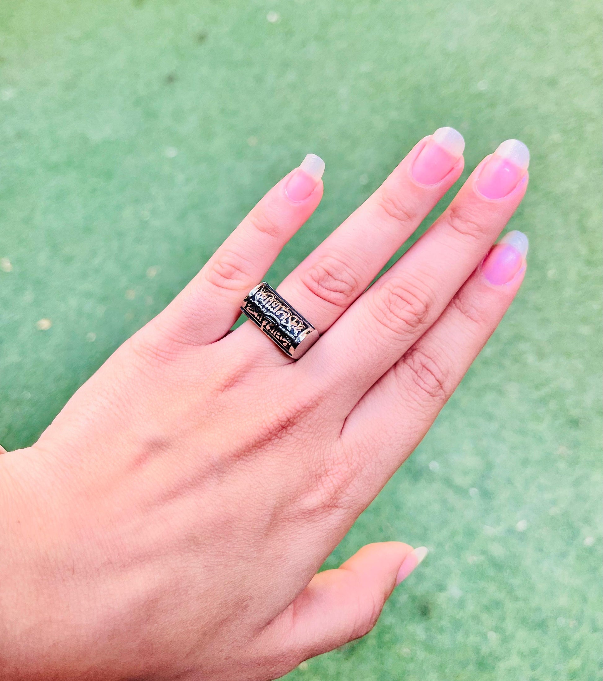This is a bold, band-style ring with a modern, substantial design, likely crafted from silver-tone or oxidized metal. The ring features a rectangular or shield-shaped face that is engraved with a decorative pattern and a meaningful inscription. The central feature is the Arabic phrase "أنت هو القلب"