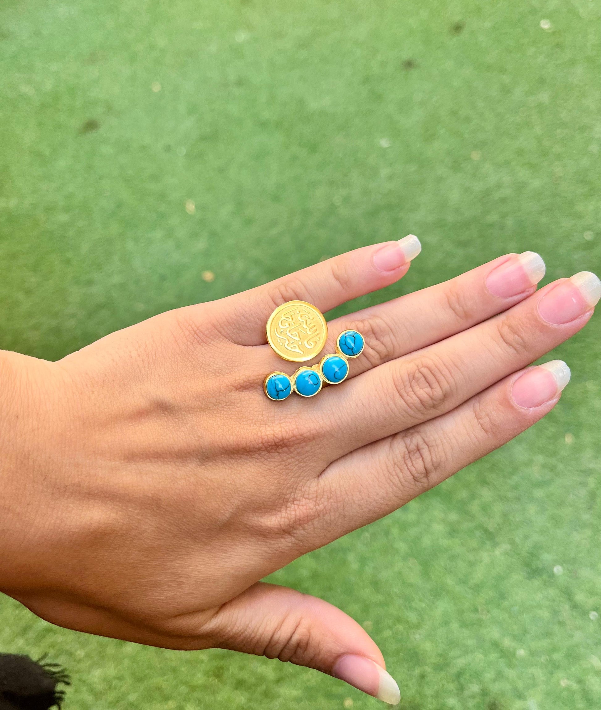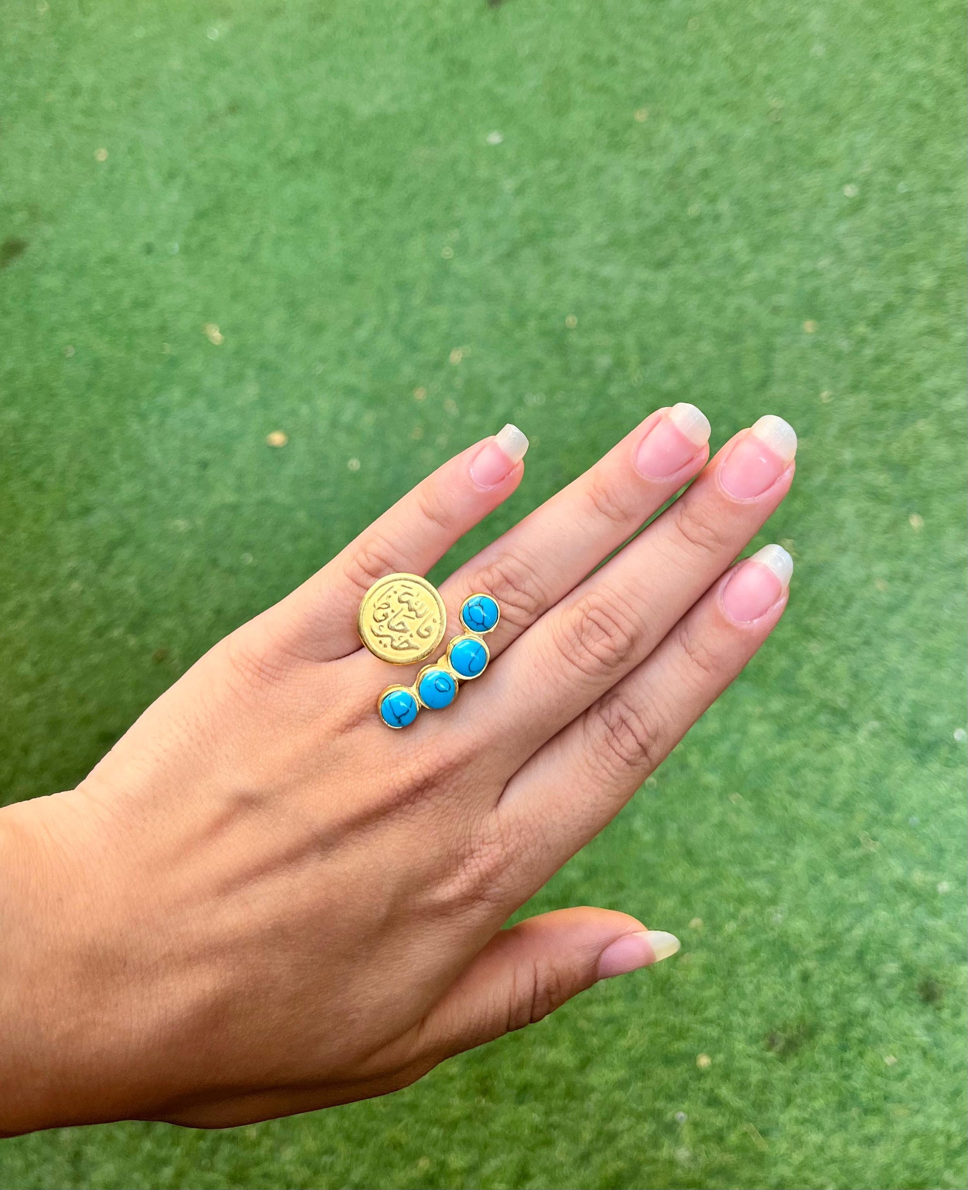This is a modern, asymmetrical statement ring with a bold design. The ring features a large, round gold-tone element on one side, which appears to be a coin or disc engraved with decorative script or symbols.