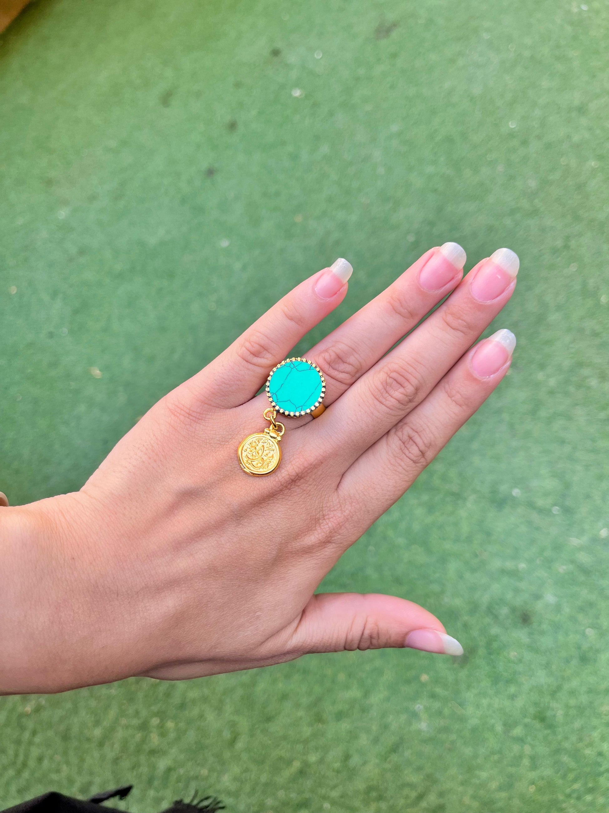 This is a bohemian-style statement ring centered around a large, circular cabochon stone in a brilliant turquoise color. The stone is set in a prominent gold-tone bezel that features a serrated or sunburst-style edge, adding texture and detail.