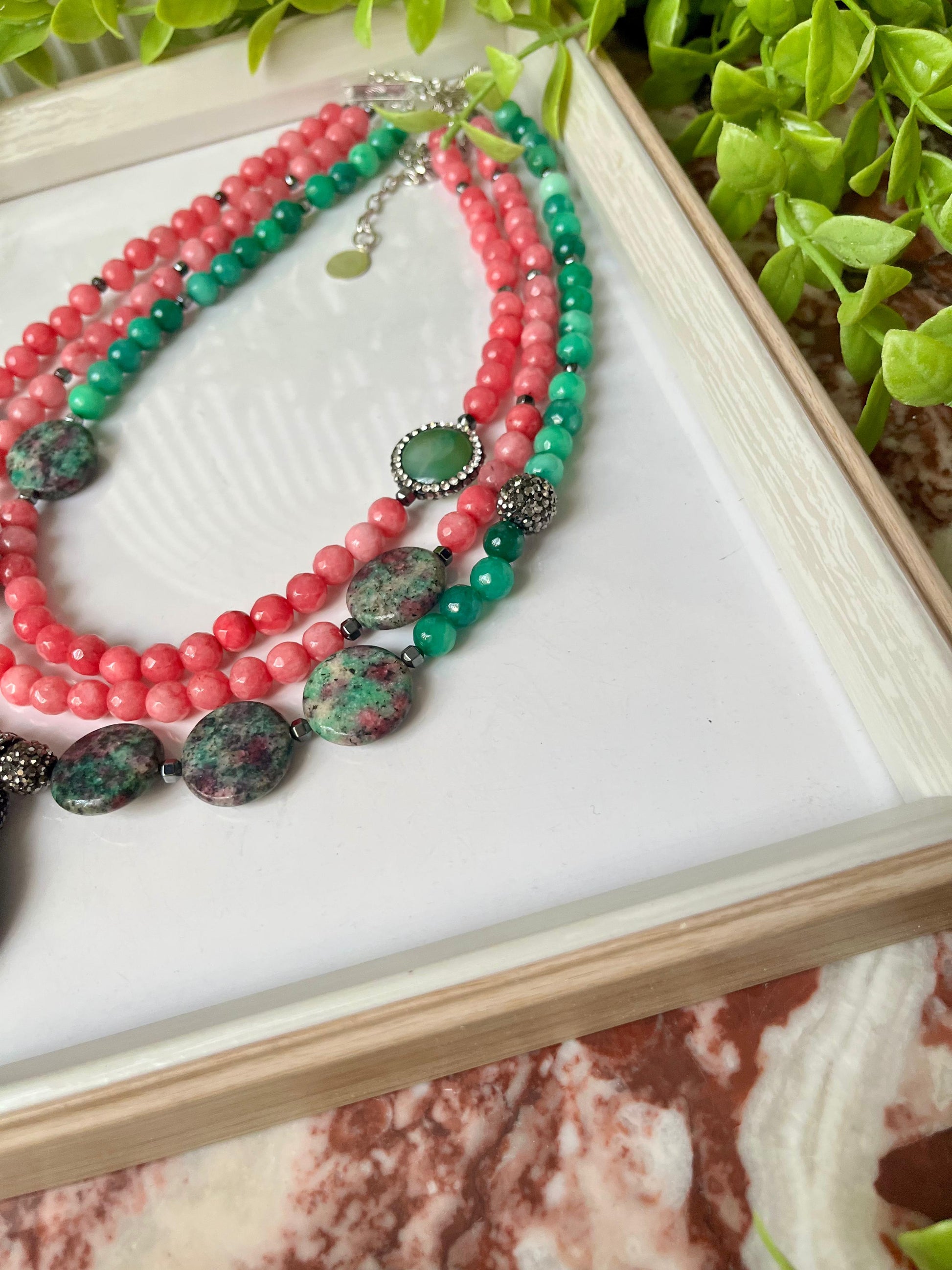 Gorgeous three-strand necklace in a dramatic color-block of coral pink and deep green. Anchored by a beautiful classic cameo pendant, this piece is a bold, feminine statement blending antique charm with modern color.